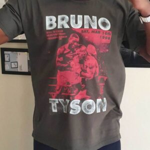 Charcoal t-shirt featuring an in the ring graphic of Frank Bruno landing a shot to Iron Mike Tyson. The second time the pair met in the ring fighting in 1996 for the WBC heavyweight title at the MGM Grand, Nevada, US. A range designed and printed by Merch® in the UK.